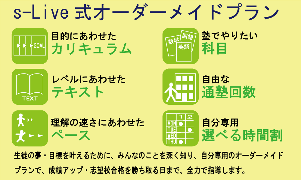 カリキュラム・テキスト・ペース・テキスト・通塾回数・時間割等すべて一人ひとりにあわせて組んでいきます。いろいろな状況のお子様がおりますので、面談時にご相談させていただき最適なプランをご提案させていただきます。